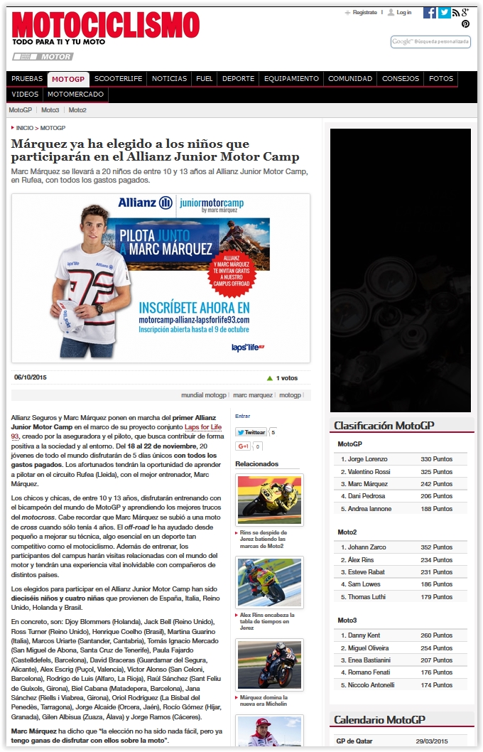 La ilusión de Marcos era participar en el Allianz Junior Motor Camp by Marc Márquez, en el que el propio campeón elegiría a 20 jóvenes promesas, de entre 10 y 13 años de diferentes nacionalidades, que participarían de un exclusivo curso de formación en Barcelona impartido por el propio Marc, con todos los gastos pagados.